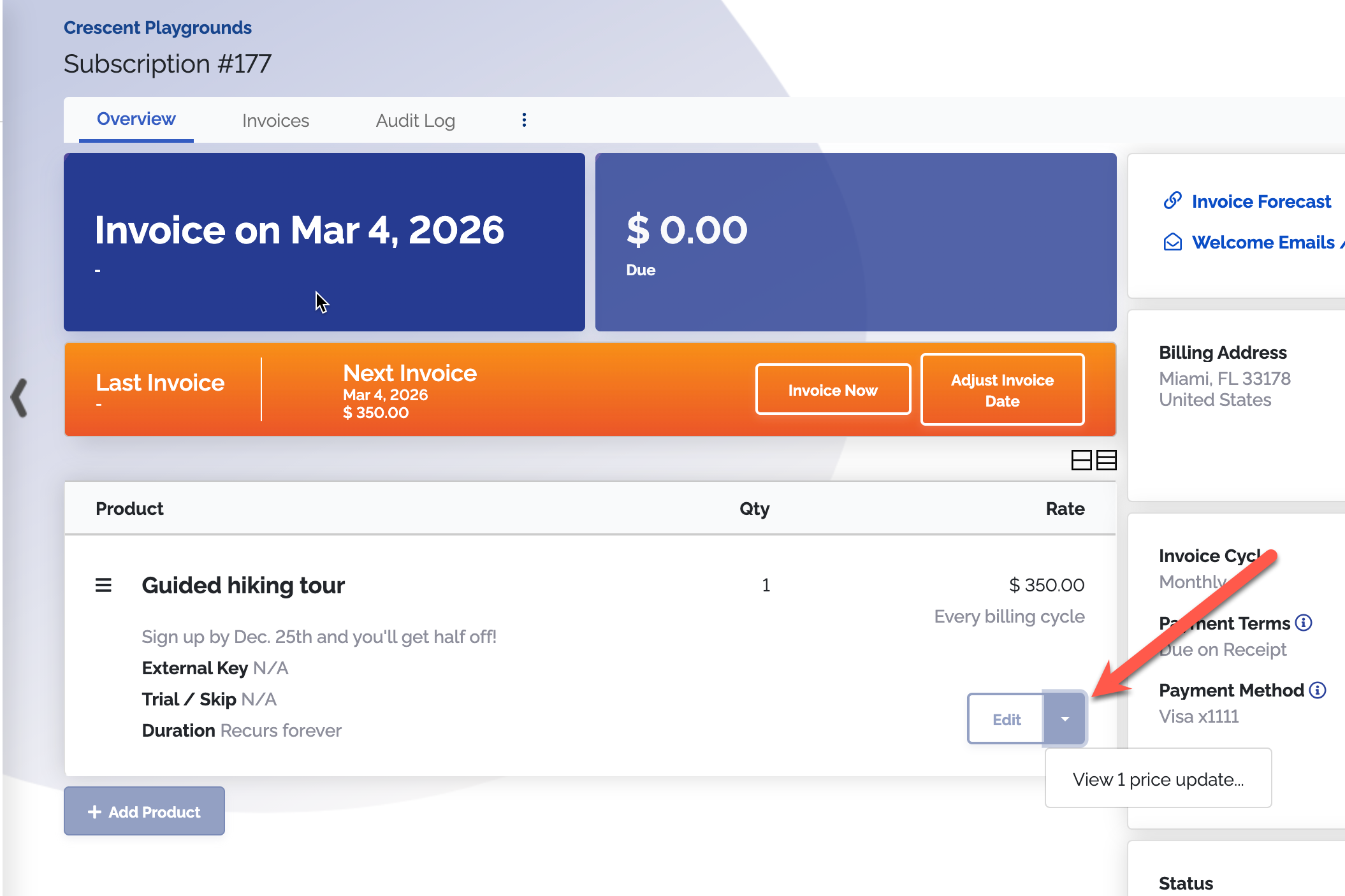 You can configure a product to have a default price update schedule. Any newly created, upgraded, or downgraded subscriptions with this product will take on its default price update schedule.