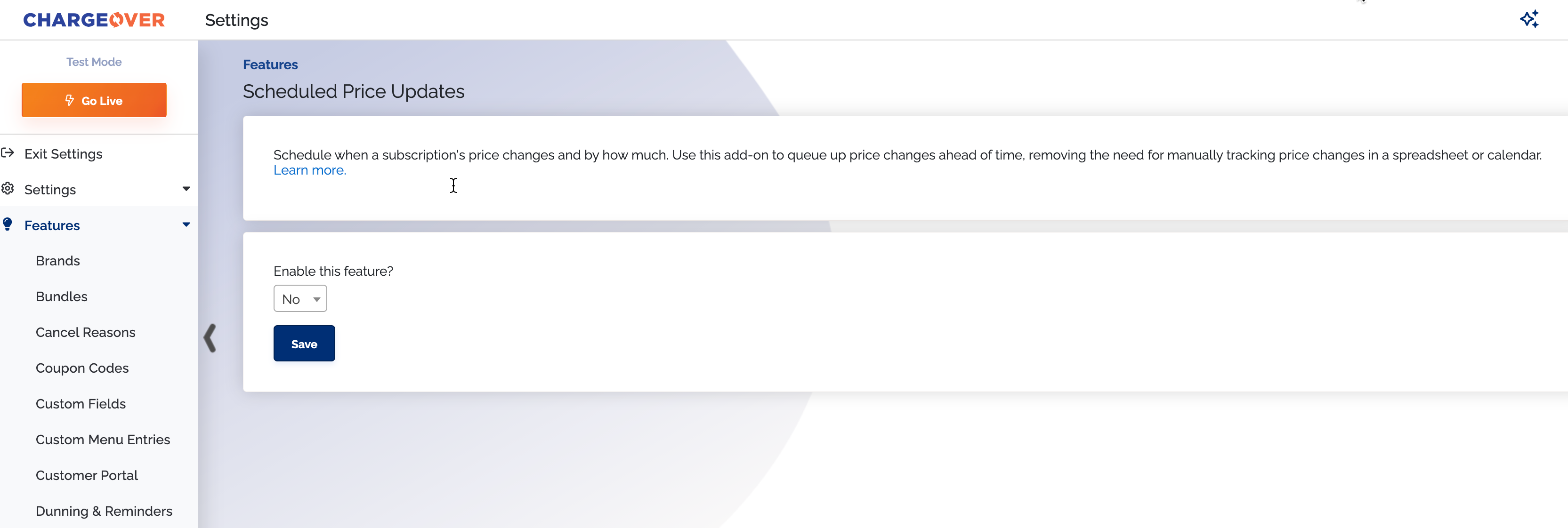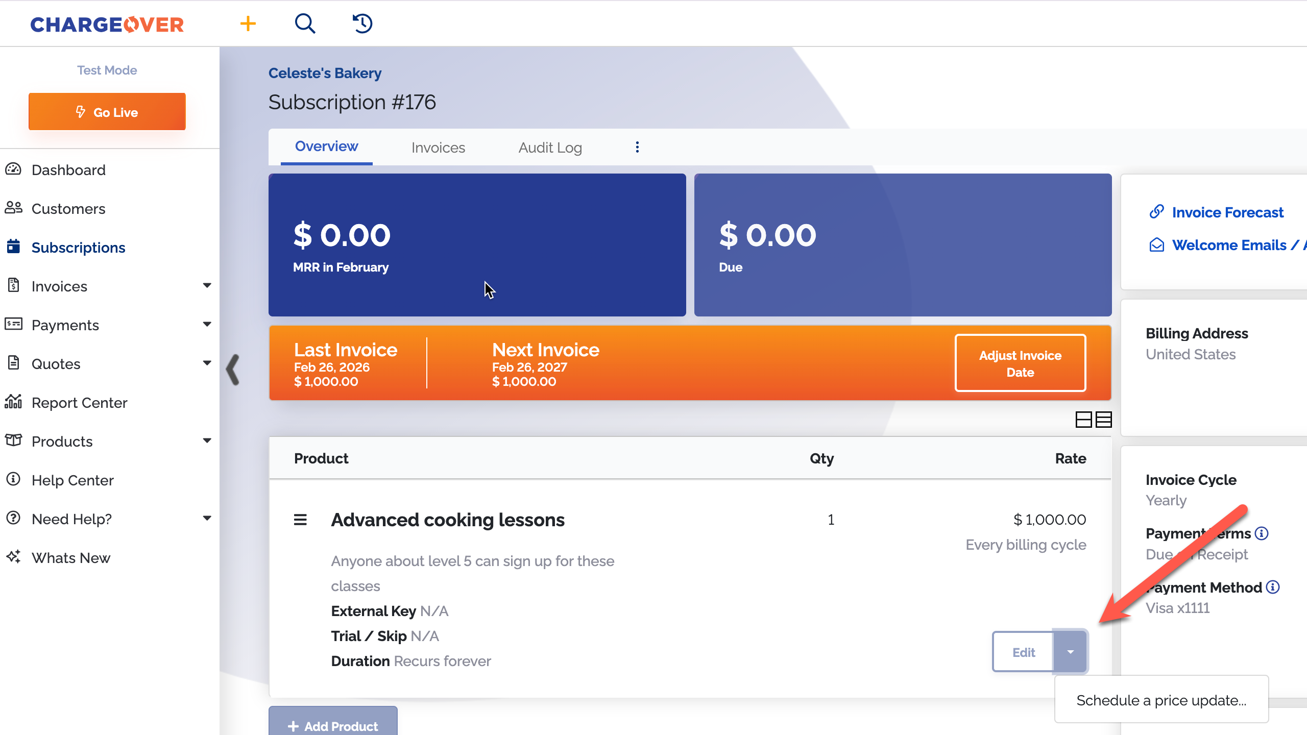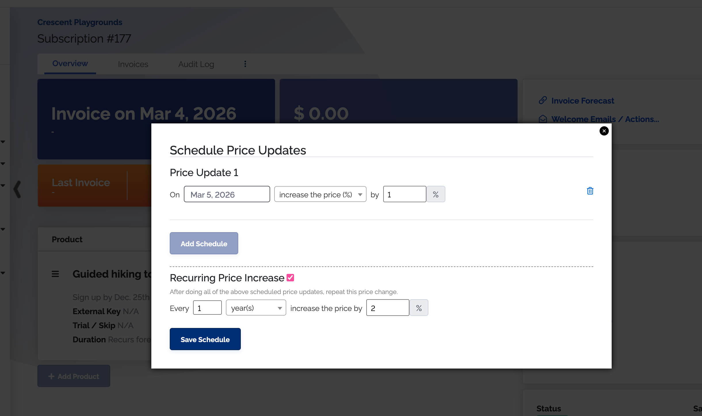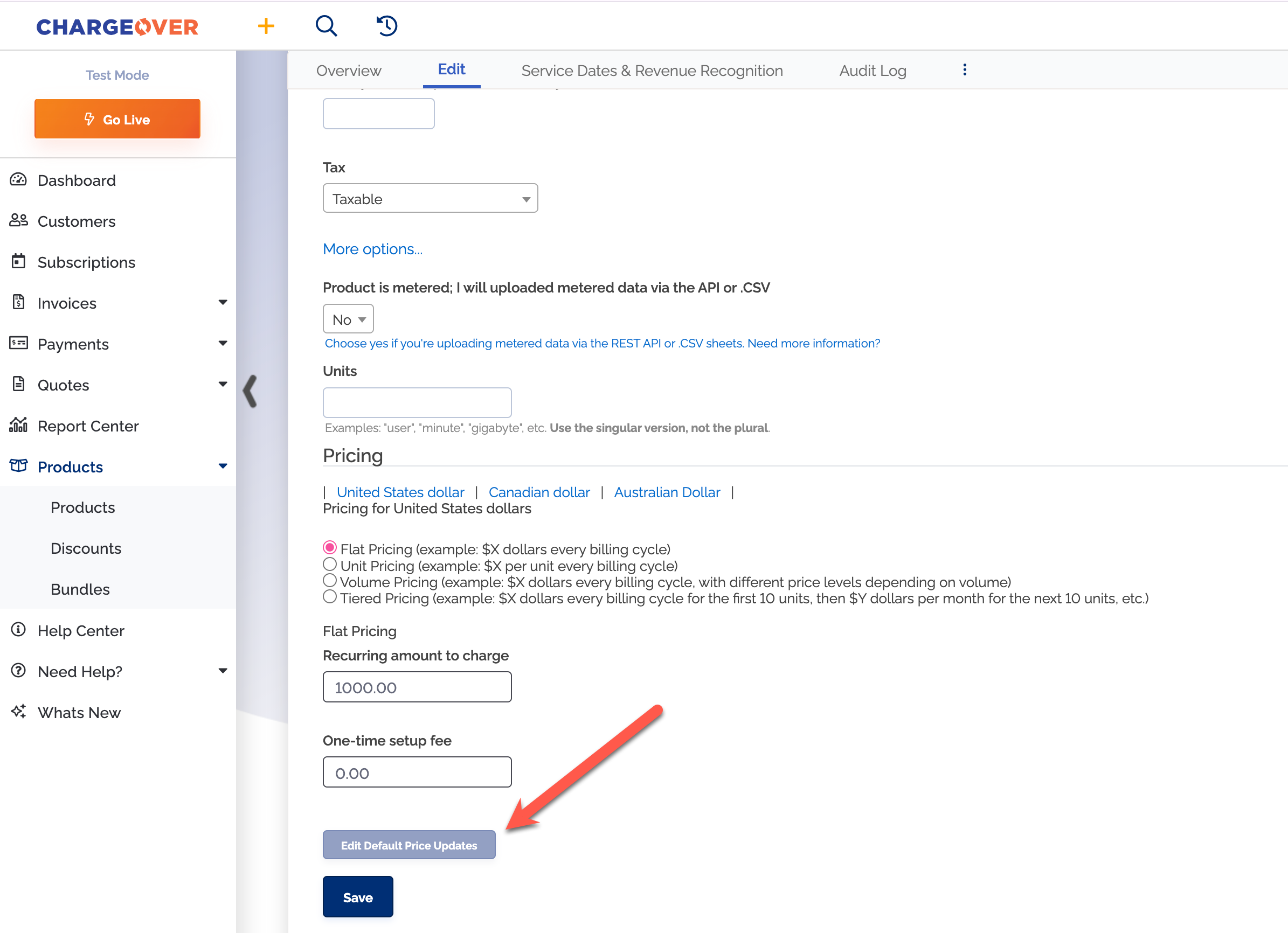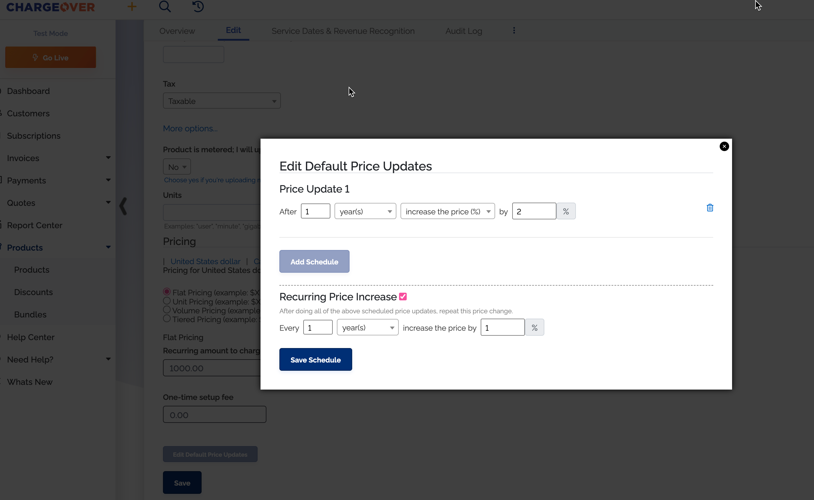 We recommend using our scheduled price updates feature if you'd like to change a subscription's pricing in advance. This removes the need for manually tracking price updates in a spreadsheet or calendar. ChargeOver allows you to schedule automatic price updates on products so that they occur on a specific date. You can also schedule automatic price updates to occur on a repeating schedule. For instance, you can use this feature to schedule yearly price increases on your subscriptions.