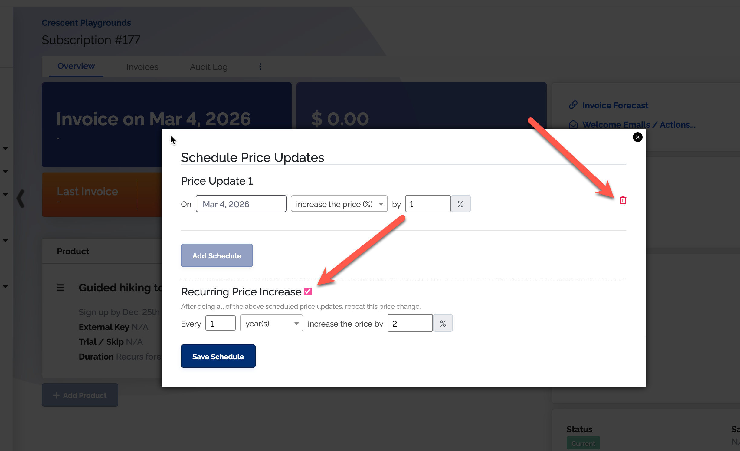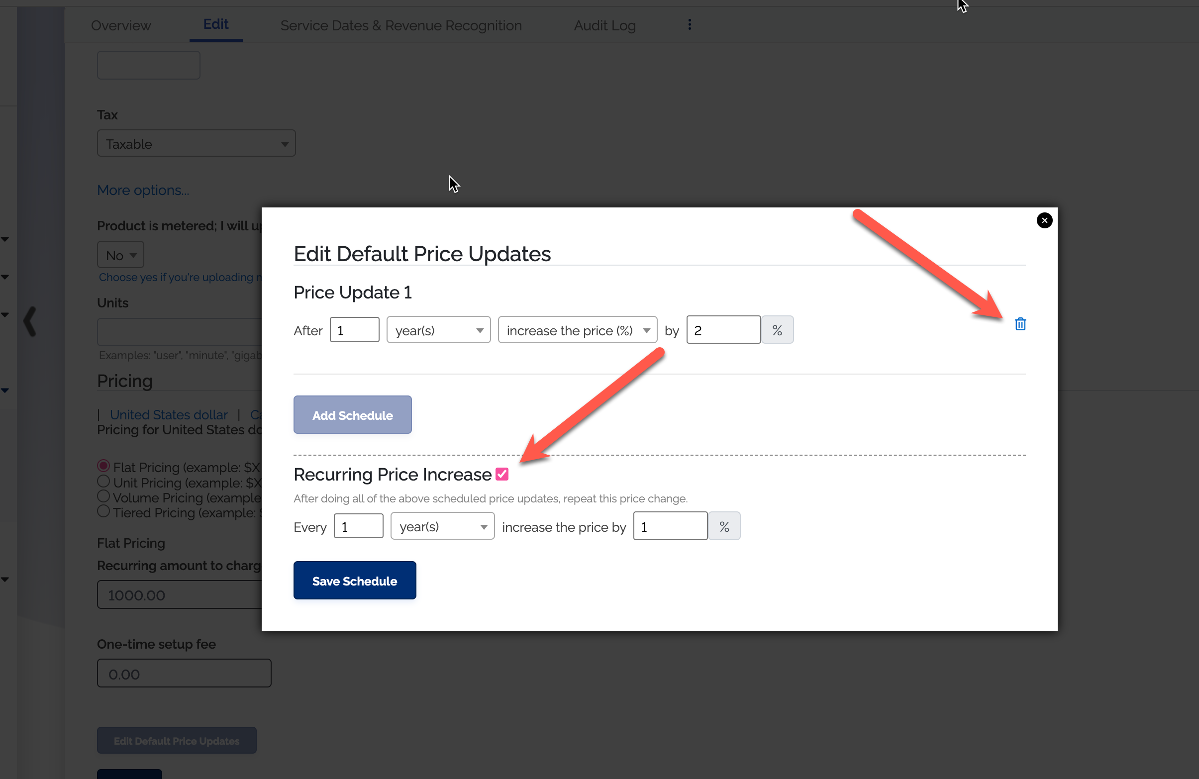 - Depending on what kind of price update you have set and which one you want to delete, you can either click the trash icon or uncheck the box next to the recurring price increase header