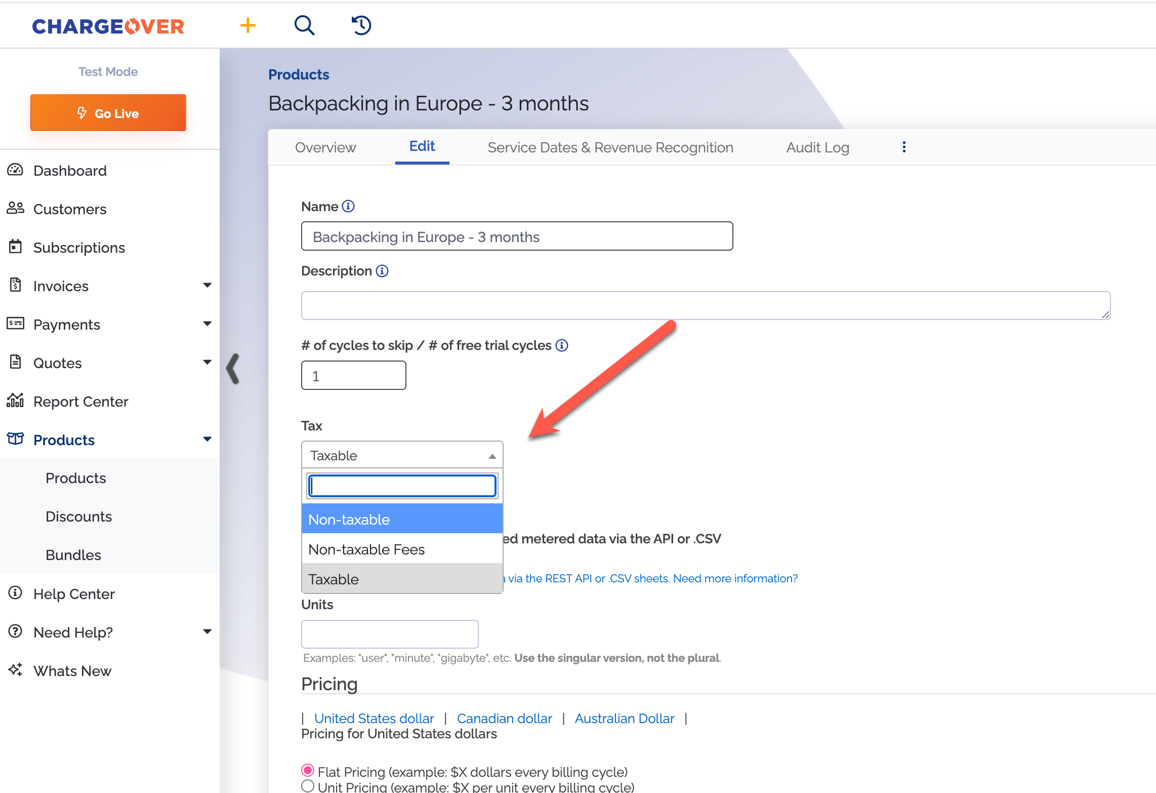 Edit tab - Select the non-taxable option from the tax dropdown