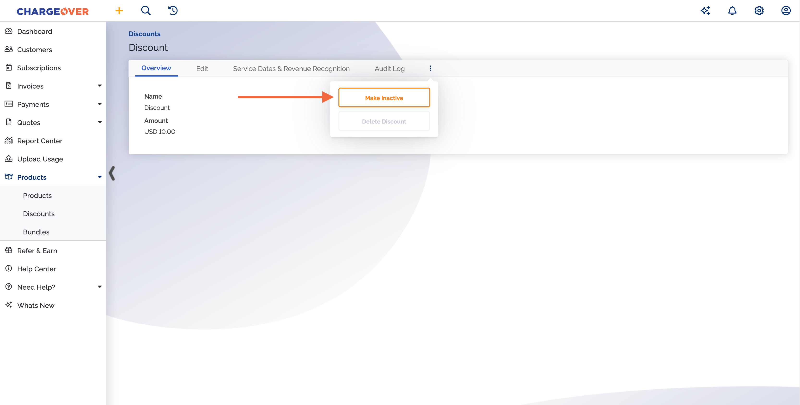 Discounts are a pre-built functunality in ChargeOver. They allow you to give your customers money off on products. You can find discounts under the products tab on your main dashboard on the left-hand side of your screen.