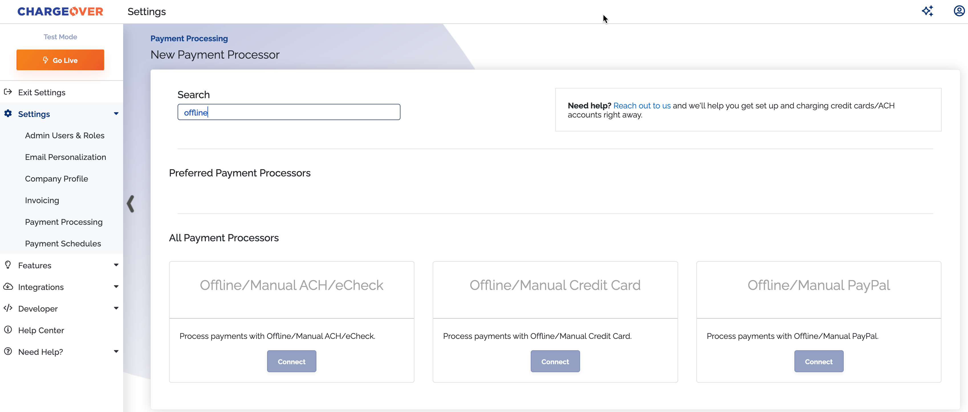 Any payment method you set up in ChargeOver is immediately available to you and your admin users.