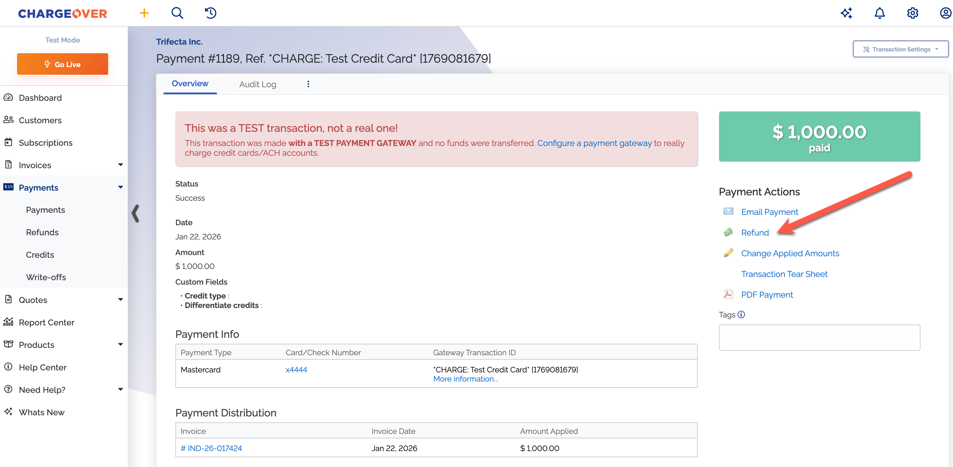Our refund process has many features you can utilize to refund a transaction. You can explore how to refund a payment and close or keep the associated invoice open in ChargeOver, after you have refunded the payment. And you can do this all in one place with our refund process.