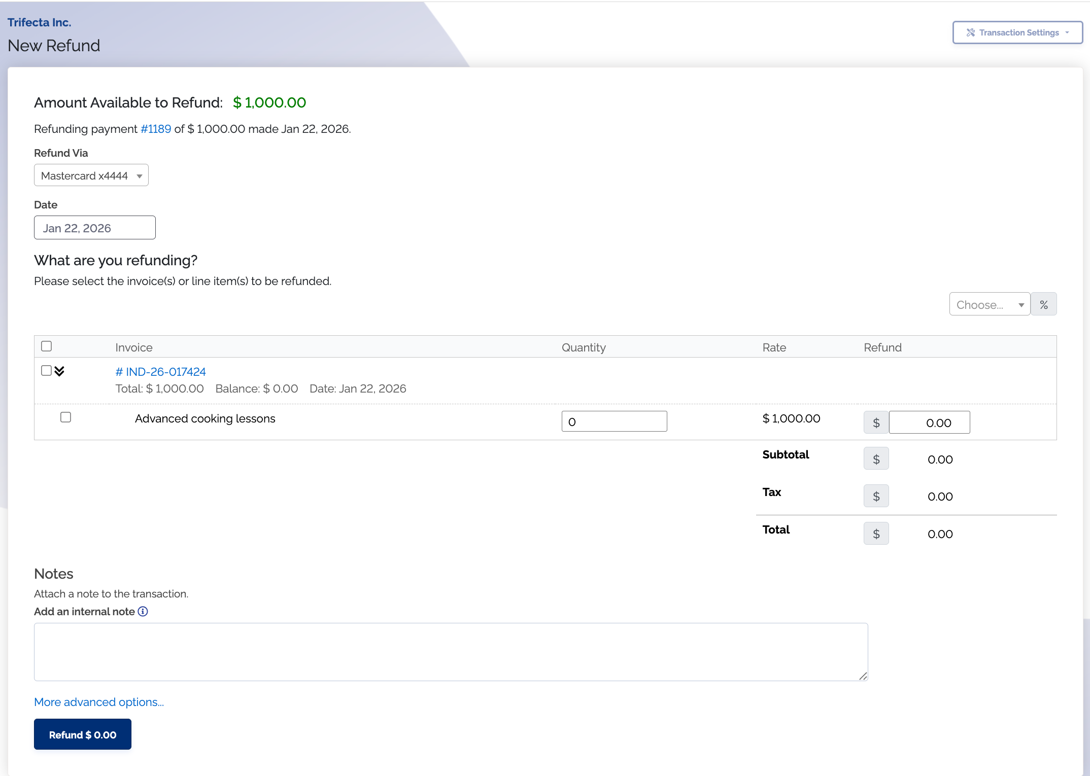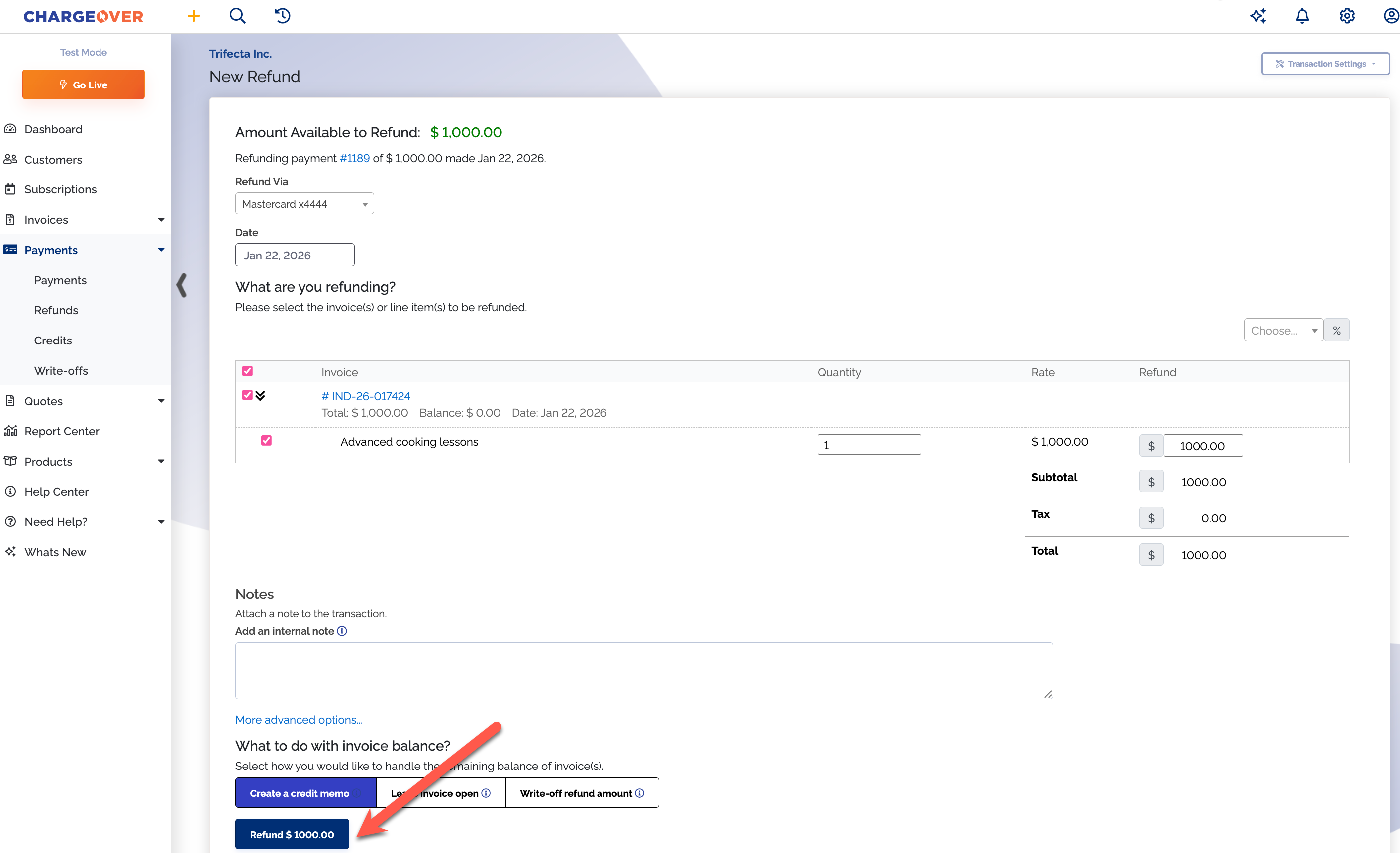 After deciding how much of the payment you want to refund, you'll have three options to choose from regarding what you would like to do with the invoice balance